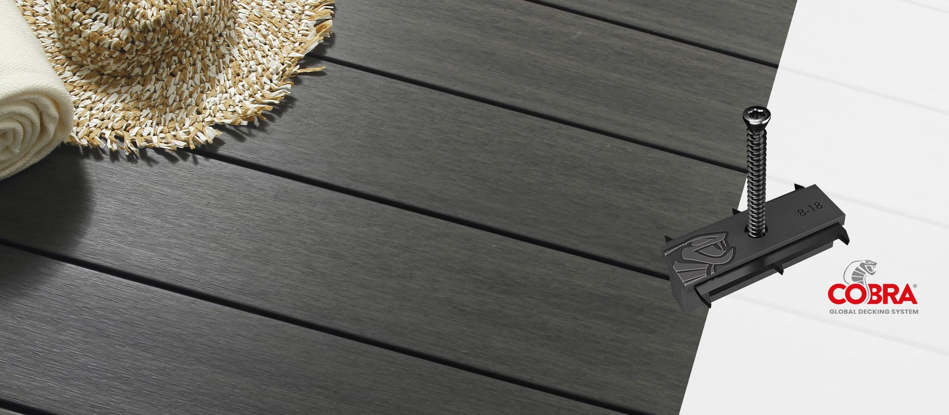 De Cobra® Hybrid 8-18 clip is compatibel met terrasplanken in composiethout en thermisch gemodificeerd hout, voor installatie op houten en aluminium draagbalken.