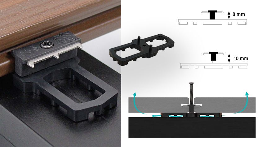 De Cobra Airspacer wig bevordert de ventilatie tussen de plank en de draagbalk zonder de werking van de bevestigingsclip of de beweging van het hout te beïnvloeden.