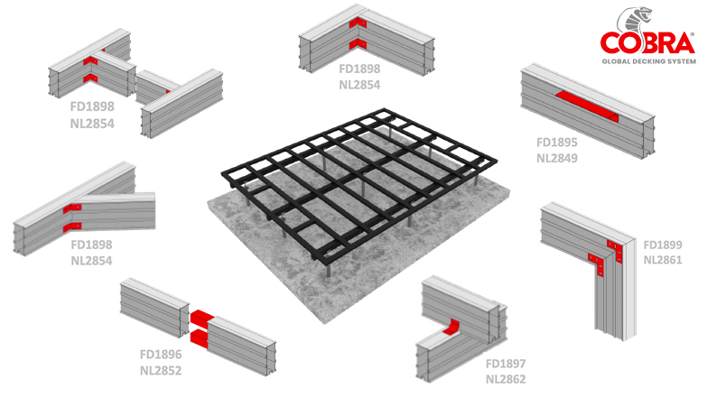 De huls en deze beugels laten een enorm aantal combinaties tussen draagbalken toe om een veelheid aan terrasstructuren te creëren die voldoen aan alle beperkingen of inspiraties.