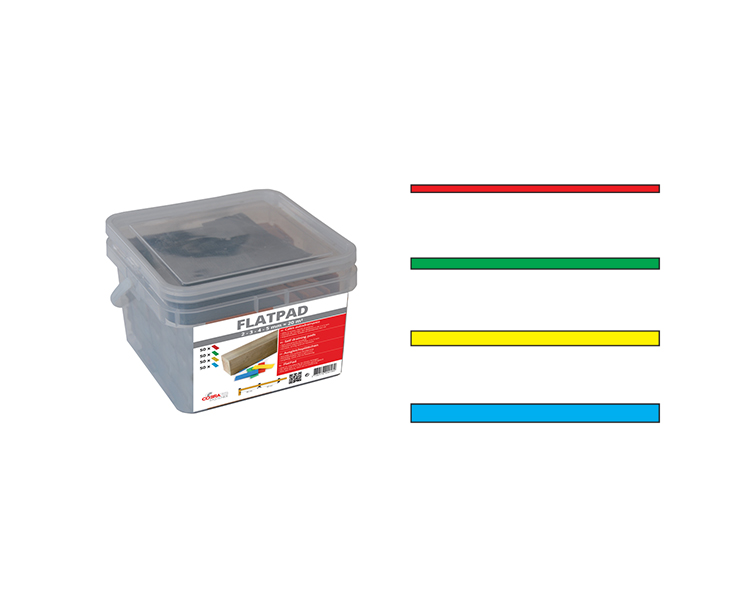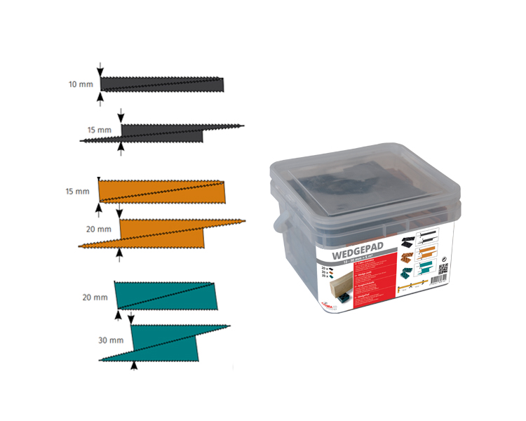 RUBBERPAD wiggen zijn verkrijgbaar in een 3 mm of 8 mm dikke uitvoering. De instelbare hoogte is van 3 tot 40 mm (tot 5 wiggen van 8 mm).