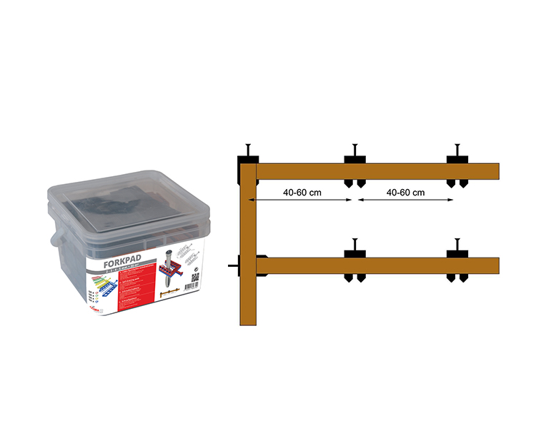 Geschikt voor 10mm deuvels die geslagen moeten worden. De FORKPAD's kunnen op elkaar gestapeld worden en worden ingeklemd tussen de deuvel en de draagbalk. Elke FORKPAD-wig moet 40 tot 80 cm van elkaar verwijderd zijn, afhankelijk van de dikte van de balk.