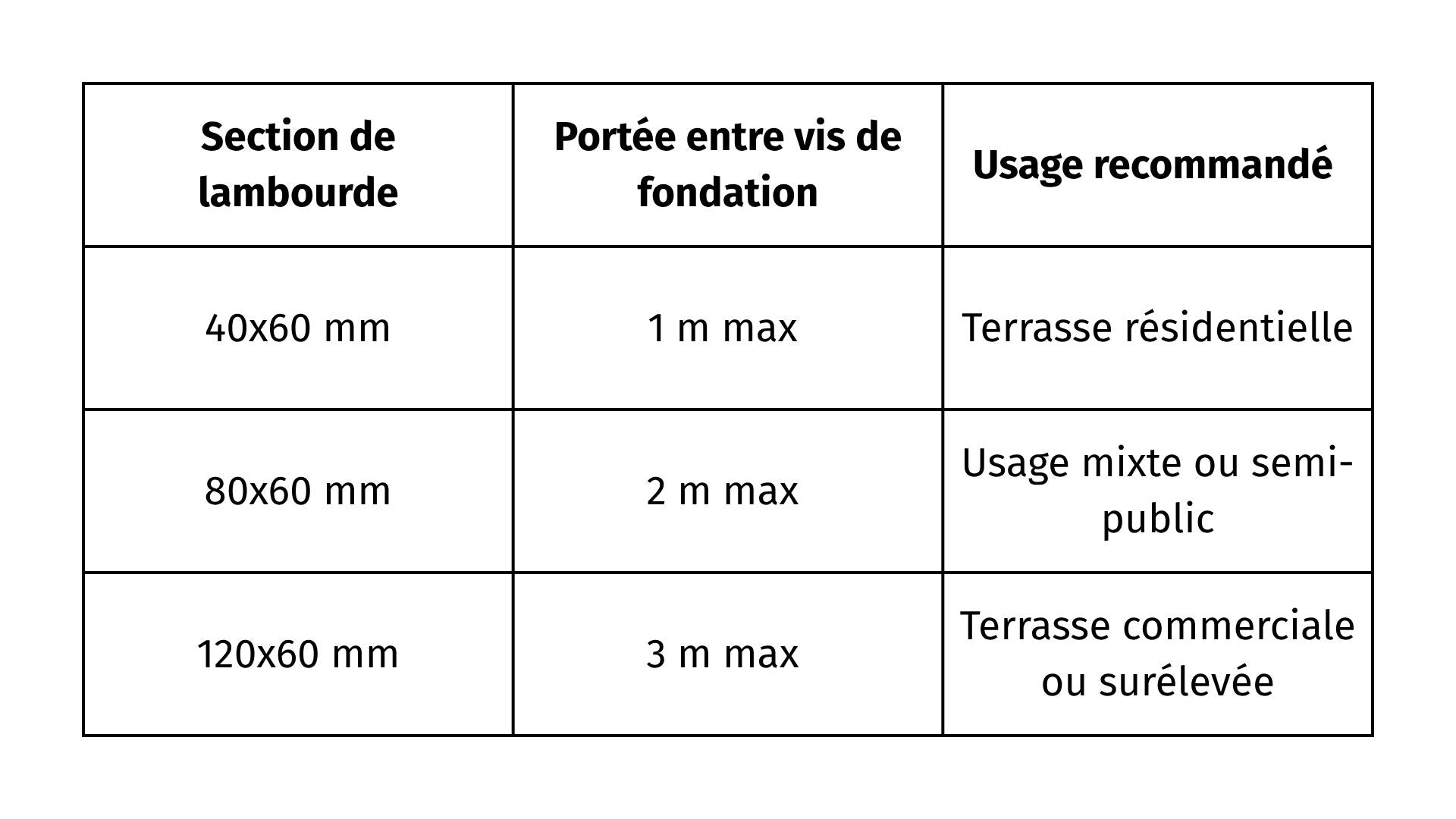 - les entraxes maximaux entre vis selon la section de lambourde (40×60, 80×60, 120×60 mm),