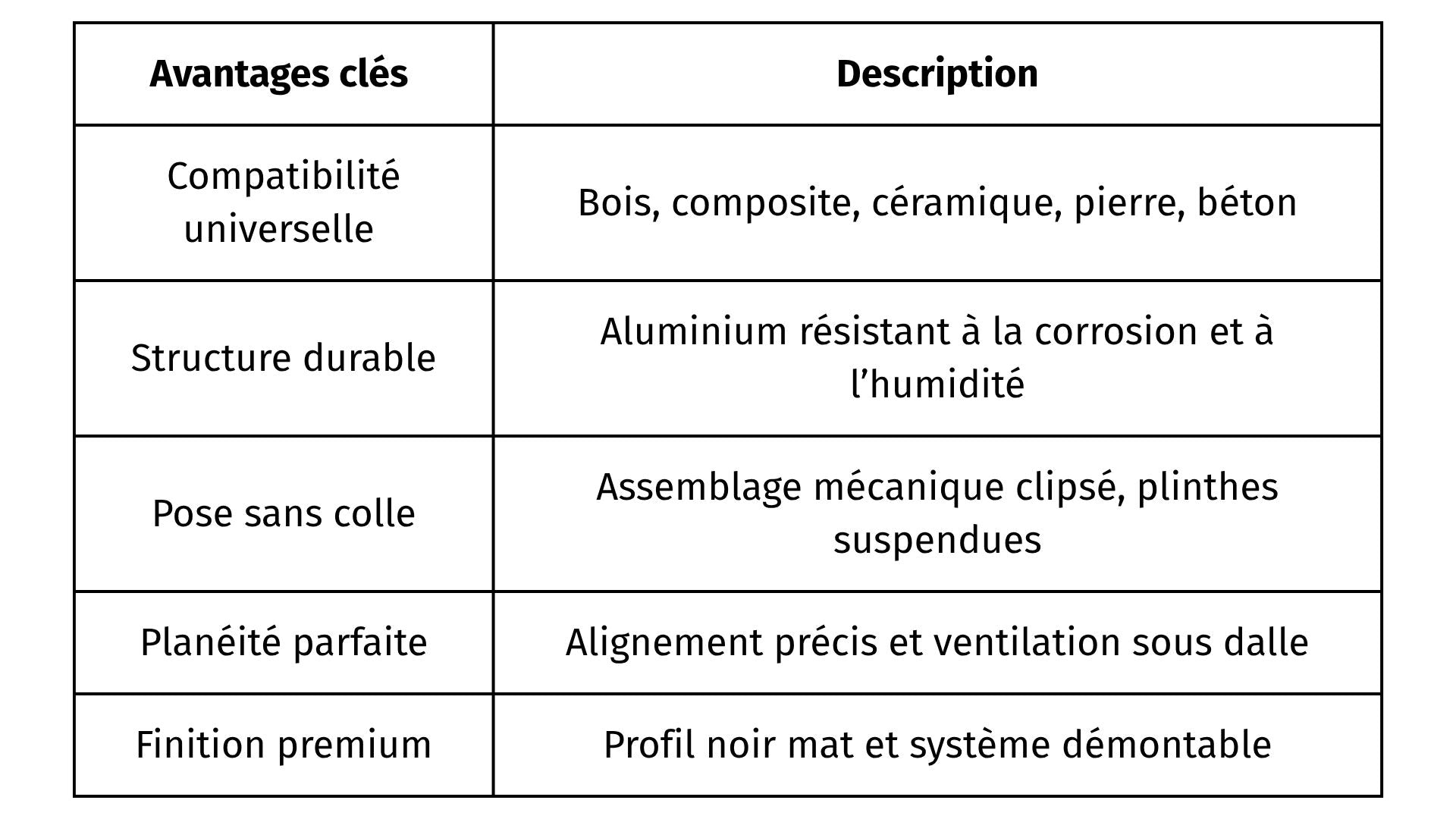 - Finition noir mat RAL 9005, discrète et élégante, invisible sous les dalles.