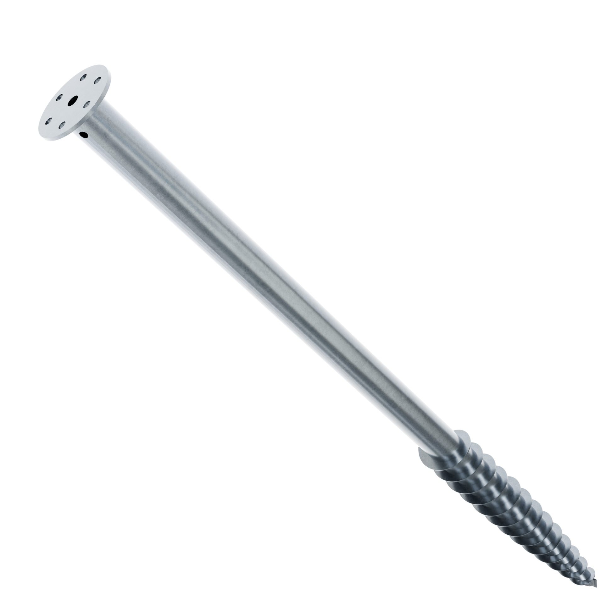 Versterkte gegalvaniseerde stalen funderingsschroef ontworpen om in de grond een houten of aluminium structuur bestaande uit gekruiste balken en dwarsbalken te verankeren. Moet in losse grond en opvulling op een minimale diepte van 80 cm worden gedreven. Vervangt effectief en economisch beton. Elke schroef kan een belasting van 1000 kg dragen. Verkrijgbaar in lengtes van 800 mm, 1200 mm en 1500 mm. Diameter 60 mm. Geleverd zonder steunbevestigingskop.
